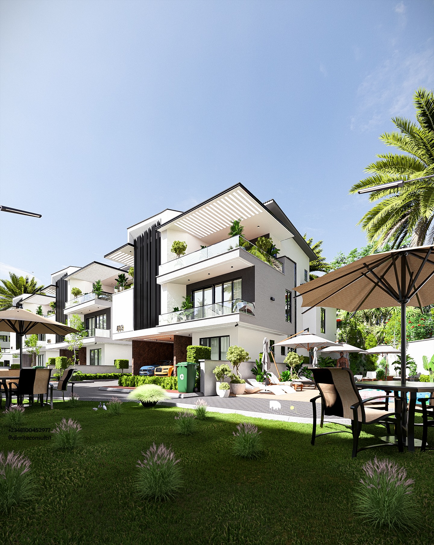 Other features include driveways, a security block, utility block, a swimming pool, greenery, surveillance cameras, good headroom clearance, and spacious window openings for adequate daylight penetration.