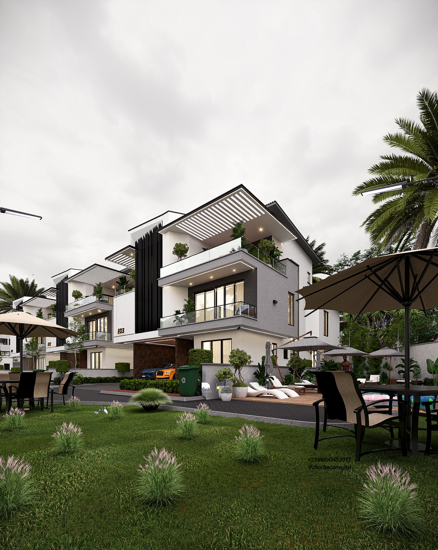 Other features include driveways, a security block, utility block, a swimming pool, greenery, surveillance cameras, good headroom clearance, and spacious window openings for adequate daylight penetration.